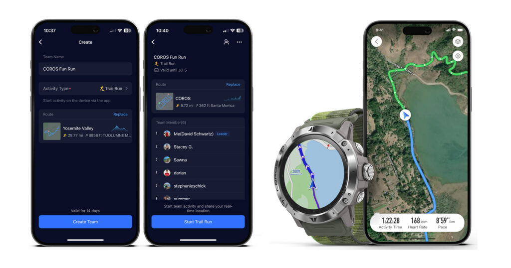 Luôn giữ kết nối trong các buổi chạy hoặc đạp nhóm với tính năng Theo dõi nhóm. Từ trang Hồ sơ trong ứng dụng COROS, thiết lập tính năng này trước khi bắt đầu để bạn và các thành viên trong nhóm có thể theo dõi vị trí của nhau theo thời gian thực ngay trên thiết bị COROS.