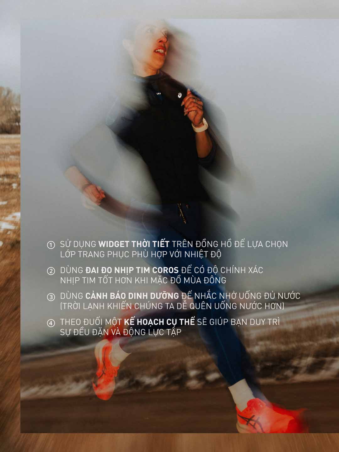Thời tiết lạnh thường được tính là dưới 10°C. Lúc đầu, hiệu suất chỉ giảm nhẹ, nhưng khi nhiệt độ xuống thấp hơn nữa, ảnh hưởng sẽ rõ rệt hơn. Cơ bắp hoạt động chậm, phản xạ kém, và cơ thể sẽ dồn máu về phần thân để giữ ấm. Với người tập sức bền, điều này có nghĩa là cơ thể phải tốn nhiều năng lượng hơn để giữ nhiệt, khiến việc tập nặng hơn và nhanh mệt hơn. Khi máu lưu thông kém, cơ dễ bị cứng, làm tăng nguy cơ căng cơ và chấn thương. Vì vậy, khởi động kỹ là điều không thể bỏ qua. Hãy dành 5–10 phút cho các động tác làm nóng và giãn cơ động để cơ thể sẵn sàng vận động. Uống đủ nước cũng rất quan trọng. Trời lạnh khiến bạn ít thấy khát, nhưng cơ thể vẫn mất nước qua hơi thở và mồ hôi. Đừng quên bổ sung nước trước, trong và sau buổi chạy. Nếu vẫn muốn tập ngoài trời vào mùa đông, hãy cân nhắc tập ngắn hơn hoặc chọn thời điểm ấm nhất trong ngày. Bạn có thể dùng widget thời tiết hoặc chức năng Môi trường trên đồng hồ COROS để xem nhanh điều kiện thời tiết tại vị trí của mình, từ đó lên kế hoạch tập hợp lý hơn.