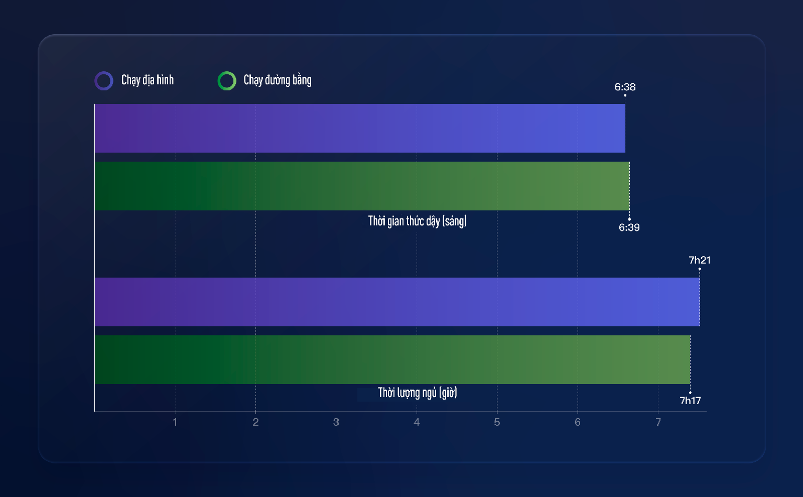 Cả 2 nhóm vận động viên đều có xu hướng tránh việc “ngủ nướng”, đảm bảo tận dụng tối đa thời gian ban ngày để kịp hoàn thành bài chạy. Người chạy địa hình thường thức dậy vào khoảng 6:38 sáng, sớm hơn chỉ 1 phút so với người chạy đường bằng (6:39 sáng). Thời lượng giấc ngủ giữa hai nhóm cũng gần như giống nhau, với người chạy địa hình ngủ trung bình 7 giờ 22 phút, nhỉnh hơn đôi chút so với 7 giờ 18 phút của người chạy đường bằng.