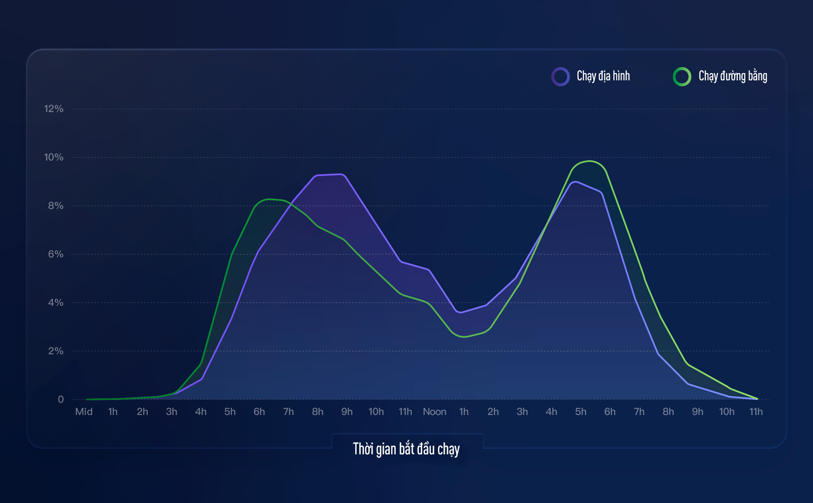 Khi nói đến thời gian tập luyện, cả hai nhóm đều ưu tiên chạy vào buổi sáng và buổi tối. Người chạy đường bằng thường bắt đầu sớm hơn, với 24% các buổi chạy diễn ra từ 6h đến 9h sáng. Trong khi đó, người chạy địa hình trễ hơn khoảng 2 tiếng, với 26% bắt đầu chạy trong khung 8h đến 11h sáng.