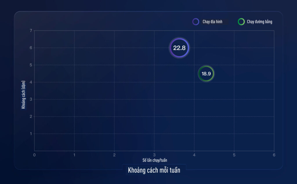 Runner đường bằng trung bình chạy 4,4 dặm mỗi buổi, với tần suất khoảng 4,3 buổi/tuần. Runner địa hình chạy xa hơn, trung bình 6 dặm mỗi buổi, nhưng ít buổi hơn, khoảng 3,8 buổi/tuần.