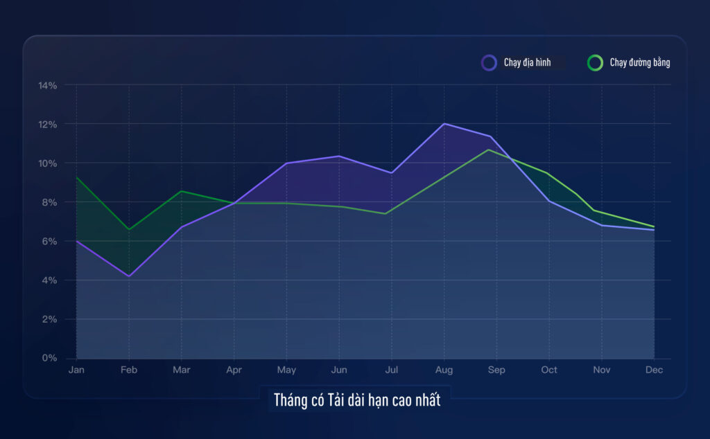 Yếu tố mùa tập cũng đóng vai trò quan trọng. Runner địa hình thường đạt đỉnh vào tháng 8, nhờ các giai đoạn tập dài trong mùa hè trên núi. Trong khi đó, runner đường bằng thường đạt phong độ cao nhất vào tháng 9, trùng với mùa giải marathon mùa thu. Vào mùa đông, runner đường bằng có xu hướng duy trì thể lực tốt hơn, còn runner địa hình thường sụt giảm rõ rệt – có thể do điều kiện thời tiết hạn chế khả năng tiếp cận đường trail.