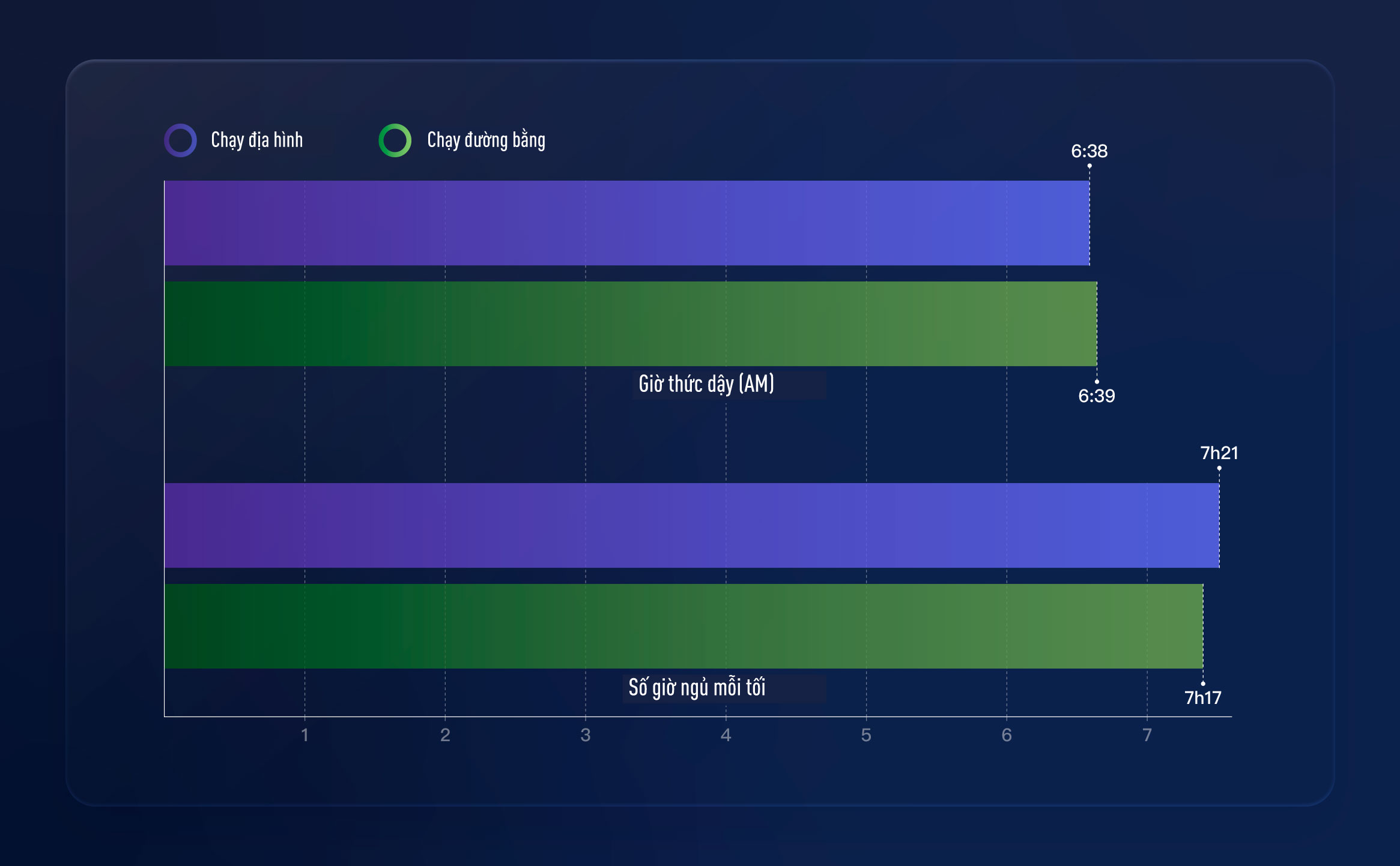 Cả hai nhóm runner đều có xu hướng không ngủ nướng, nhằm tận dụng ánh sáng ban ngày để hoàn thành buổi chạy. Runner địa hình thường thức dậy vào khoảng 6:38 sáng, chỉ sớm hơn runner đường bằng 1 phút (6:39 sáng). Thời lượng ngủ của hai nhóm cũng gần như tương đương, trong đó runner địa hình ngủ nhiều hơn một chút (7 giờ 22 phút so với 7 giờ 18 phút).