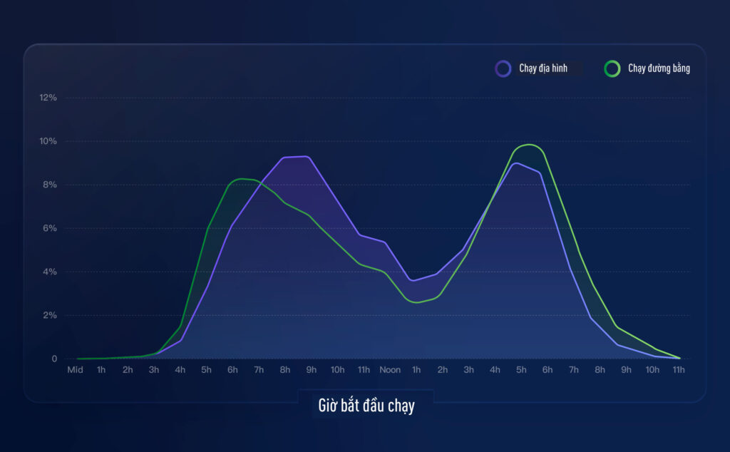 Vào buổi chiều, hai nhóm có xu hướng khá giống nhau: 26% runner đường bằng và 24% runner địa hình chạy trong khoảng 4–7 giờ tối. Còn thời điểm mà cả hai nhóm đều né tránh? Giờ trưa. Dù là do lịch làm việc, thời tiết nóng hay cảm giác no bụng, chỉ 9% runner đường bằng và 12% runner địa hình chạy trong khung 12–2 giờ chiều.