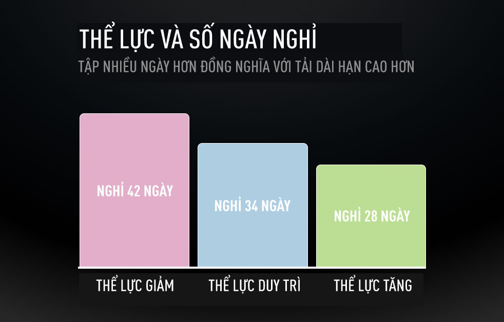 Nhiều ngày tập hơn đồng nghĩa với Tải dài hạn cao hơn. Xu hướng rất rõ ràng: càng ít ngày nghỉ không cần thiết, kết quả càng tốt. Bạn không cần phải chạy mỗi ngày (thực tế, ngày hồi phục là phần quan trọng của giáo án). Nhưng duy trì tập đều đặn, kể cả với những buổi tập ngắn, sẽ giúp Tải tập luyện ổn định và Tải dài hạn tiếp tục đi lên.