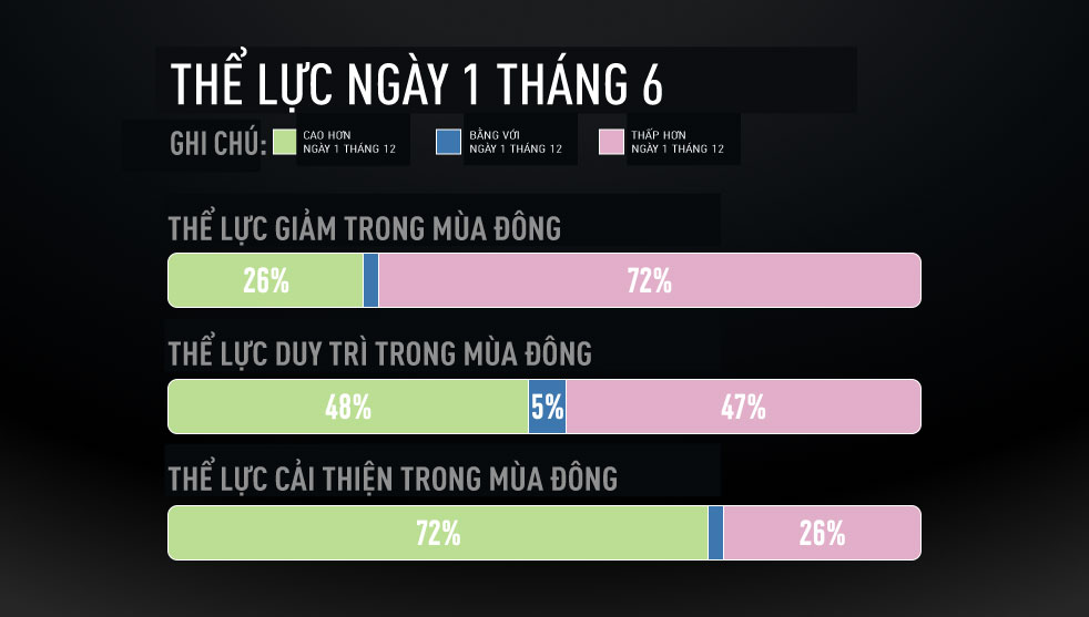 Điểm rút ra cuối cùng từ dữ liệu của chúng tôi là: cách bạn tập luyện trong mùa đông sẽ định hình cả phần còn lại của năm. Những vận động viên bị giảm thể lực trong mùa đông thường rất khó lấy lại phong độ, trong khi những người duy trì hoặc cải thiện thể lực sẽ mang theo đà đó sang mùa xuân. Đến ngày 1/6, kết quả của từng nhóm như sau: