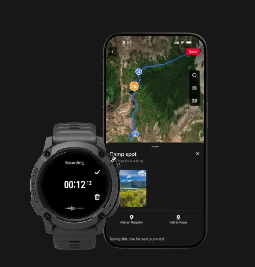 Chỉ cần nhấn nút ghi âm trực tiếp trên đồng hồ, Các đoạn ghi âm của bạn sẽ được ghim vào lộ trình trong ứng dụng COROS, giúp bạn lưu lại những khoảnh khắc chỉ lời nói mới diễn tả được.
