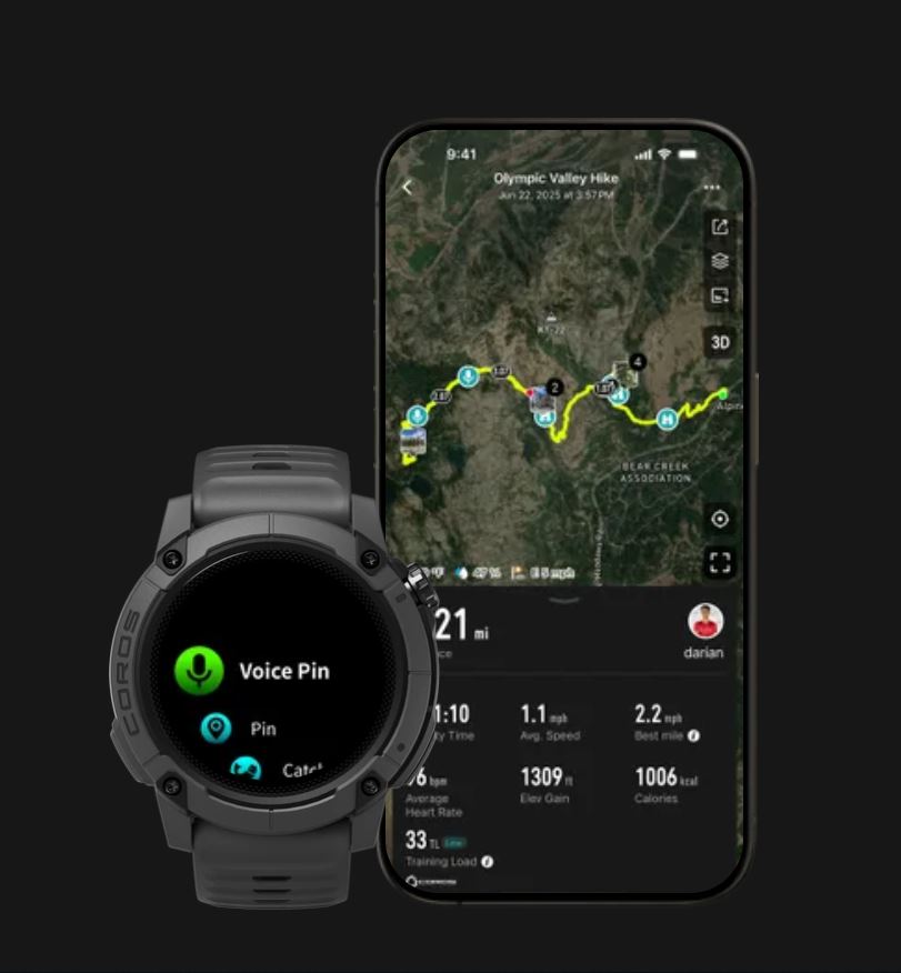 Thả ghim ngay trên đồng hồ hoặc trong ứng dụng: điểm cắm trại, chỗ qua suối, bãi câu cá và nhiều hơn nữa. Những gì bạn lưu trên đồng hồ sẽ tự động đồng bộ với ứng dụng COROS và ngược lại.